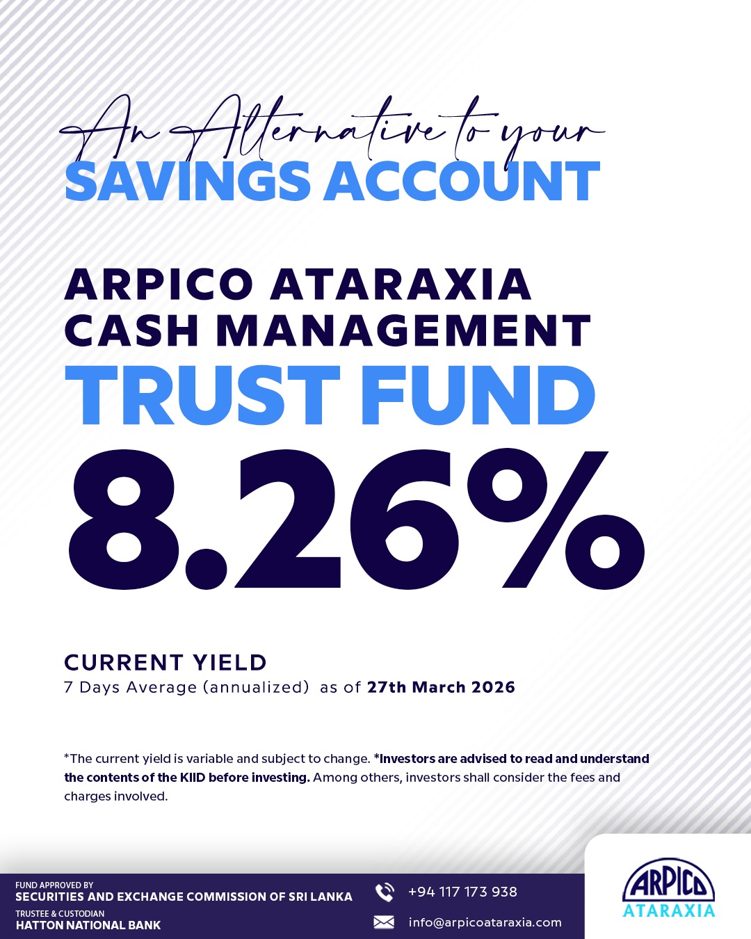 The main objective of the fund is to generate secured returns from Sri Lanka Government Securities such as Sri Lanka Treasury Bonds and Treasury Bills with different maturities.